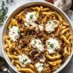 A white oval dish filled with cooked pasta, topped with golden-brown caramelized onions spread evenly across the surface. Dollops of soft, white ricotta cheese are placed in small mounds over the onions and pasta. Sprigs of fresh green thyme are scattered on top for a touch of color. The dish is set on a white marbled surface with some garlic cloves and a wooden spoon nearby. Photo taken with an iphone --ar 4:5 --v 7