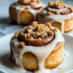 Three cinnamon rolls sit on a white plate with close-up focus on the front roll. The front cinnamon roll has two layers visible: the soft, brown swirled dough with a slightly crispy texture on the outside, and a thick layer of creamy white icing dripping down the sides. On top, small crumbly brown sugar pieces add texture. The two cinnamon rolls in the background are slightly blurred but show the same layers of dough, icing, and crumb topping. The setting is a white marbled surface. Photo taken with an iphone --ar 4:5 --v 7