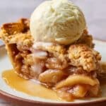 A close-up image of a slice of apple pie on a white plate with a brown rim, placed on a white marbled surface. The pie has three visible layers: the bottom layer is a thick, glossy layer of baked apple slices in a light brown syrup, the middle layer is the golden-brown crust that looks flaky and crumbled, and the top layer is a rough, golden lattice crust with a scoop of creamy, pale vanilla ice cream melting slowly over it. The melting ice cream creates a smooth, shiny texture that drips down onto the pie and plate. photo taken with an iphone --ar 4:5 --v 7