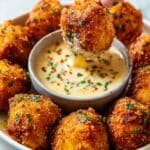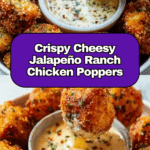 These Cheesy Jalapeño Ranch Chicken Poppers are crispy, spicy bite-sized appetizers filled with shredded chicken, sharp cheddar cheese, and fresh jalapeños, seasoned with ranch spices and garlic. They are breaded and deep-fried to golden perfection, served with a creamy, tangy ranch dip that complements the poppers perfectly, making them an irresistible snack or party starter.