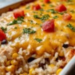 This Cheesy Salsa Chicken and Rice Bake is a hearty, flavorful casserole that combines tender shredded chicken, cooked rice, and zesty salsa, all topped with melted cheddar cheese. Perfect for a cozy weeknight meal, it’s loaded with black beans and corn for added texture and nutrition. The dish is seasoned with warm spices like cumin, garlic, and chili powder to bring a delicious southwestern flair to your dinner table.