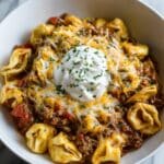 Cheesy Taco Tortellini combines tender cheese-filled tortellini with seasoned ground beef and a rich, creamy queso sauce. Infused with bold taco spices and simmered in savory beef broth, this one-skillet dish delivers comforting Tex-Mex flavors perfect for a quick and satisfying weeknight meal or family dinner.