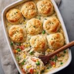 Keywords: Chicken pot pie casserole, comfort food, easy dinner, chicken casserole, biscuit topping, creamy chicken dish