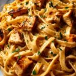 Cowboy Butter Chicken Linguine is a creamy, flavorful pasta dish featuring tender, spiced chicken breasts cooked with garlic, smoked paprika, and a butter-based sauce. Tossed with linguine and a rich Parmesan cream sauce, this hearty meal is garnished with fresh parsley for a touch of freshness and elegance, perfect for a satisfying weeknight dinner or weekend treat.
