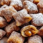 A close-up view of many small square-shaped fried pastries stacked together, each with a light brown crispy outer shell covered in a dusting of white powdered sugar. One pastry is cut open near the center showing a smooth, glossy caramel filling inside with a rich golden color. The pastries have a rough texture from frying, and the powdered sugar creates a contrast with the golden brown dough. The scene is set against a soft white marbled surface. photo taken with an iphone --ar 4:5 --v 7