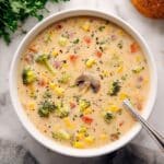 This creamy vegetable soup combines tender baby potatoes, mirepoix vegetables, broccoli, and sweet corn in a rich cheddar cheese-infused cream sauce. Perfectly seasoned with Italian herbs and simmered to a comforting thickness, this soup is a hearty and flavorful dish ideal for a cozy lunch or dinner.