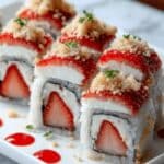 This Creative & Cute Strawberry Shortcake Sushi Roll is a playful twist on the classic dessert, featuring a soft sponge cake rolled with a luscious cream cheese and whipped cream filling, fresh diced strawberries, and sweet strawberry preserves. Perfect for impressing guests or making a fun, elegant treat at home, this no-bake roll-up dessert combines vibrant flavors and eye-catching presentation, garnished with optional white chocolate drizzle and mint leaves.