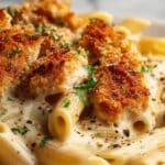 This close-up image shows a creamy pasta dish with penne pasta coated in a smooth, light-colored cheese sauce, layered with pieces of golden-brown breaded chicken on top. The chicken pieces have a crispy and crumbly texture, with some darker toasted crumbs. Small sprinkles of fresh green herbs add a pop of color scattered over the dish. Tiny black pepper flakes are visible, adding texture and contrast. The dish looks rich, creamy, and crispy all at once, presented on a white plate against a white marbled textured background. Photo taken with an iphone --ar 4:5 --v 7