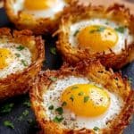 Keywords: hash brown baskets, eggs in baskets, breakfast recipe, baked eggs, crispy hash browns, cheesy potato nests, brunch ideas