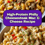 Keywords: Philly cheesesteak mac and cheese, high protein mac and cheese, creamy mac and cheese, easy dinner recipe, ground beef recipes