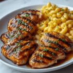 - Combine and Serve: Toss the drained elbow macaroni into the cheese sauce to coat evenly. Plate the creamy mac & cheese and top each serving with a honey garlic butter coated chicken breast. Garnish with chopped fresh parsley or chives for a pop of color and freshness.