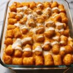 This Loaded Buffalo Chicken Tater Tot Bake is a deliciously easy dinner recipe combining tender shredded chicken tossed in spicy buffalo sauce with creamy cheeses and crispy tater tots baked to golden perfection. Finished with ranch dressing and green onions, it’s a perfect crowd-pleasing comfort meal for busy weeknights or game days.
