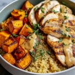 - Assemble Bowls: Slice the cooked chicken breasts. In serving bowls, layer quinoa or brown rice with roasted sweet potatoes and top with the sliced chicken.