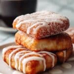 The image shows a close-up of several square fried dough pastries with a crispy golden-brown exterior and a soft, light inside layer. Some pastries are covered with a layer of white icing drizzled in thin, uneven lines on top, adding a shiny and smooth texture. Others are coated with a rough, grainy sugar layer that gives a contrasting matte look. The pastries are stacked slightly, placed on a white plate, with a blurred white cup filled with black coffee in the background over a white marbled surface. photo taken with an iphone --ar 4:5 --v 7