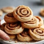 The image shows six cinnamon roll cookies stacked on a white plate with a white marbled surface underneath. Each cookie has distinct swirls with a golden-brown outer layer and a darker cinnamon filling in the middle. The texture looks soft and slightly crumbly with some sprinkled cinnamon on top. A woman's hand is reaching toward the plate from the left side. Photo taken with an iphone --ar 4:5 --v 7