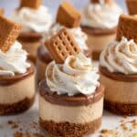 Delight in these Mini Biscoff Cheesecakes featuring a crunchy Biscoff cookie crust topped with a creamy and fluffy Biscoff-spiced cheesecake filling. Finished with whipped cream, melted Biscoff spread, and crunchy cookie crumbles, these no-bake treats are perfect for any occasion and offer rich, indulgent flavors in every bite.