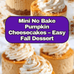 Mini No Bake Pumpkin Cheesecakes are the perfect fall dessert featuring a simple crunchy granola bar crust and a luscious pumpkin-flavored cream cheese filling. These bite-sized cheesecakes require no baking, making them quick and easy to prepare. Chilled until firm, they are topped with whipped cream and a sprinkle of cinnamon for a delightful seasonal treat.