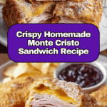 A Monte Cristo Sandwich is a decadent fried sandwich featuring layers of turkey, ham, Swiss and cheddar cheese between honey wheat bread. This recipe involves assembling the sandwich, chilling it to firm up, then dipping it in a light batter before deep-frying until golden and crispy. The sandwich is finished with a dusting of confectioners’ sugar and served with raspberry preserves for a sweet and savory bite.