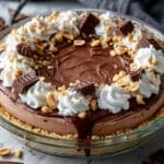 - Add the Whipped Cream Topping: Spread or pipe the chocolate whipped cream evenly over the chilled peanut butter pie.