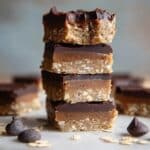 - Melt and Pour the Chocolate: Combine chocolate chips and coconut oil in a small bowl. Microwave in 30-second bursts, stirring between each until the chocolate is smooth and glossy. Spoon the melted chocolate evenly over each oat base and smooth the top with the back of a spoon.