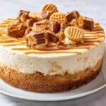 This Nutter Butter Cheesecake is a rich and indulgent dessert combining creamy peanut butter cheesecake with a crunchy Nutter Butter and toffee crust. Topped with a smooth peanut butter drizzle and extra cookie pieces, it’s perfect for peanut butter lovers looking for a show-stopping treat.