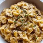 This creamy Parmesan Garlic Beef Bowtie Pasta is a hearty and flavorful one-pan meal featuring browned ground beef, garlic, and onion in a savory sauce made with beef broth, Parmesan cheese, and half and half. The sauce is perfectly seasoned with Worcestershire sauce, Italian seasoning, smoked paprika, and a hint of red pepper flakes, then tossed with tender bowtie pasta for a comforting Italian-American dinner option.