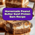 Peanut Butter Swirl Protein Bars are chewy, soft baked bars made from rolled oats and vanilla whey protein powder, naturally sweetened with honey or maple syrup, and topped with a visually appealing melted peanut butter swirl. These bars make a perfect high-protein snack or meal prep option, offering balanced nutrition with protein, healthy fats, and complex carbohydrates. Suitable for vegetarian diets and adaptable for vegan diets by substituting ingredients, they are an easy, wholesome treat to fuel your day or workout.