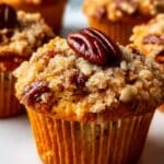 8. Add Topping: Spoon the pecan topping over each muffin and gently press a whole pecan half on top for decoration.
