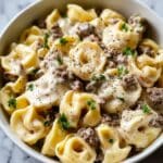 Keywords: Philly cheesesteak pasta, cheesesteak tortellini, creamy pasta recipe, ground beef pasta, comfort food, quick dinner, creamy mushroom sauce, provolone pasta