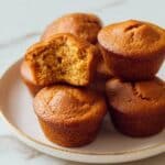 Five golden brown muffins sit close together on a white plate with a thin gold rim, placed on a white marbled surface. One muffin is cut in half and balanced on top of the others, showing a soft, moist inside with a slightly crumbly texture and a warm tan color. The muffin tops are round with slight cracks and a smooth, baked surface, and the sides show a deeper brown from baking in the pan. The lighting highlights the muffins’ warm, inviting tones. photo taken with an iphone --ar 4:5 --v 7