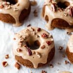 Keywords: Pumpkin spice donuts, gluten free donuts, baked donuts, maple icing, fall recipes, almond flour donuts, healthy donuts