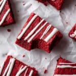 Deliciously rich and moist Red Velvet Brownies featuring a vibrant red hue, made with melted chocolate, cocoa powder, and a hint of vinegar for a classic tangy flavor. These brownies are perfect for satisfying your chocolate and red velvet cravings with an optional touch of white chocolate chips or drizzle for added sweetness.