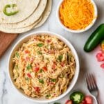- Serve: Spoon the queso chicken into warmed tortillas or hard taco shells and add your favorite taco toppings such as lettuce, sour cream, or avocado.