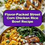 This Street Corn Chicken Rice Bowl combines juicy, seasoned chicken with charred, creamy Mexican-style street corn atop a bed of fluffy rice. Topped with fresh avocado, cilantro, and a tangy, garlicky sauce, it’s a colorful and satisfying meal perfect for weeknight dinners or meal prepping.