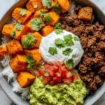 Keywords: sweet potato taco bowl, roasted sweet potatoes, taco beef bowl, healthy taco bowl, Mexican bowl, easy dinner recipe, roasted vegetable taco bowl