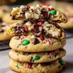 A tall stack of five round cookies sits on a white marbled surface, each cookie thick and golden-brown with a soft, slightly crumbly texture. The cookies are filled and topped with a mix of melted dark chocolate chips, white chocolate chunks, and small red and green candy pieces that add bright color spots. The top cookie is broken in half, showing a gooey dark chocolate layer inside, with the white chocolate chunks embedded within the soft cookie dough. The edges of the cookies are slightly crisp and browned. The background is softly blurred, drawing focus to the vibrant cookie stack. Photo taken with an iphone --ar 4:5 --v 7